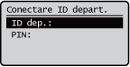 Când nu s-a implementat Gestionare ID-uri departamenteCând sunt setate doar ID-ul și PIN-ul administratorului de sistem fără gestionarea ID-ului Departamentului, trebuie să vă conectați la aparat numai atunci când doriți să configurați setările care necesită autoritatea administratorului. Introduceți ID-ul și PIN-ul în <ID administr. sistem> și <PIN admin. sistem>, apoi apăsați pe
