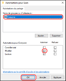 2 | Dans [Autorisations], cochez la case [Autoriser] dans [Modifier]. |