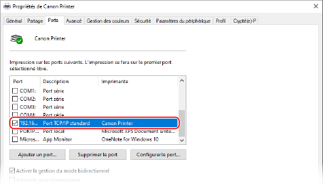 Si l'adresse IP de la machine est changéeL'intervention requise dépend du port que vous utilisez. Si [Canon MFNP Port] n'est pas affiché dans [Description], la connexion est maintenue tant que la machine et l'ordinateur se trouvent sur le même sous-réseau : vous n'avez aucune intervention à faire sur l'ordinateur. Si [Standard TCP/IP Port] est affiché dans [Description], vous devez ajouter un nouveau port. Ajout d’un port |