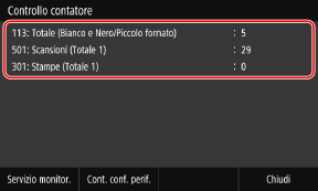 Operazioni disponibili nella schermata Controlla contatoreLe voci visualizzate sullo schermo variano in base al paese o all'area geografica. Premere [Servizio monitor.] per verificare la connessione al server di monitoraggio. Eseguire questa operazione per inviare le informazioni della macchina al server di monitoraggio con regolarità. Premere [Cont. conf. perif.] per verificare la configurazione di opzioni sulla macchina.
