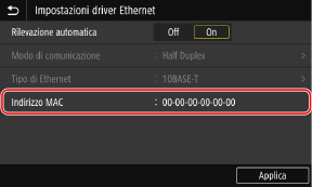 È possibile visualizzare l'indirizzo MAC impostato sulla macchina quando la macchina è connessa a una LAN cablata.