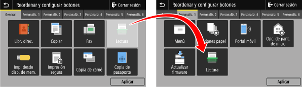 Puede reorganizar los botones en la pantalla de [Inicio] y moverlos a otras pestañas.