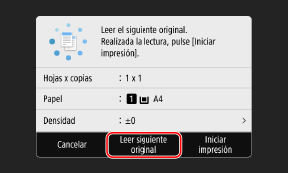 1 | Ponga el siguiente original sobre el cristal de copia y pulse [Leer siguiente original]. Se escanea el siguiente original y se muestra la misma pantalla. Repita este proceso hasta completar el escaneado de todos los originales. También puede pulsar [Densidad] y [Tipo de original] para cambiar los ajustes de cada original. Si el tamaño del original es diferente, puede faltar parte de la imagen o esta puede imprimirse a menor tamaño en el papel. |