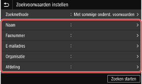 4 | Selecteer [Zoekmethode] en dan de zoekvoorwaarden. Om naar gebruikers te zoeken die voldoen aan alle in stap 3 opgegeven items, selecteert u [Met alle onderstaande voorwaarden]. Om naar gebruikers te zoeken die voldoen aan sommige van de in stap 3 opgegeven items, selecteert u [Met sommige onderst. voorwaarden]. |