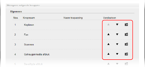 ] naast de naam van de knop die u wilt verplaatsen om de knop omhoog of omlaag te verplaatsen. Klik op [