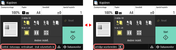 Een andere schermweergave kiezenU kunt het scherm van het configuratiescherm veranderen: bijvoorbeeld andere schermtaal en eenheden kiezen, en berichten weergeven / verbergen. [Weergave-instellingen] U kunt schermkleuren omkeren en de helderheid aanpassen zodat u makkelijker naar het scherm kijkt. [Toegankelijkheid] De instellingen automatisch wissenStandaard worden, als er gedurende een bepaalde periode geen bewerkingen worden verricht, de op het scherm gekozen instellingen gewist, en verschijnt het scherm [Start]. U kunt zelf een periode kiezen en ook het scherm dat na deze inactiviteitsperiode verschijnt. [Automatische resettijd] [Functie na automatische reset] |