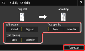 3 | Stel de afdrukstand en het openingstype in en druk op [Toepassen]. Het scherm [Andere instellingen] verschijnt weer. |