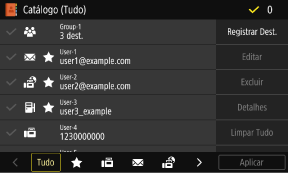 São apresentados no lado direito do ecrã. Prima para registar, editar ou eliminar um destino ou para especificar um destino para enviar ou guardar dados.
