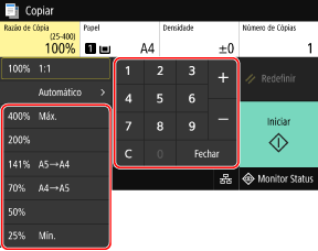 Selecione uma proporção de cópia fixa da lista ou introduza uma proporção personalizada utilizando as teclas numéricas e prima [Fechar].