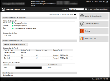 Quando inicia sessão na IU remota, aparece a página do portal (página superior da IU remota). Aqui, pode verificar o estado de funcionamento da máquina, visualizar várias informações e alterar as definições com o botão de operações.