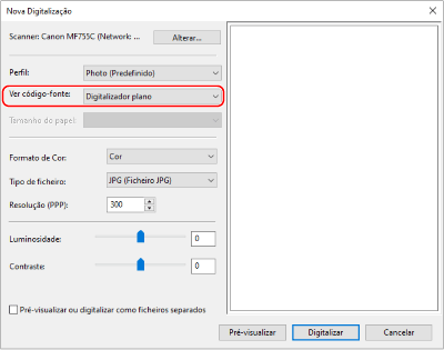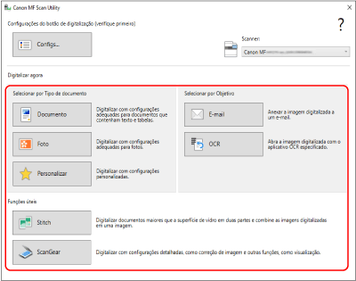 Selecione o controlador de scanner (ScanGear MF ou WIA) da máquina e configure as definições de digitalização.