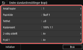 Gjenopprette standardinnstillinger til standard fra fabrikkPå skjermbildet i trinn 4, trykker du på [Initialiser]  [Ja]. |