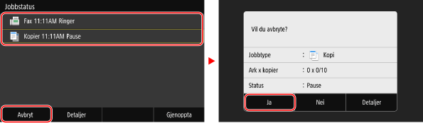 Hvis skjermbildet for jobbliste vises, velger du jobben som skal avbrytes og trykker på [Avbryt]