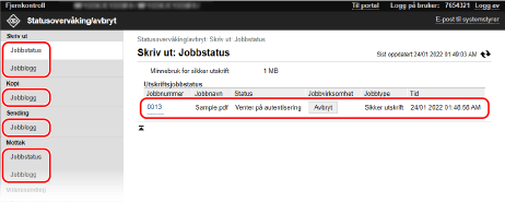 Dette viser status for alle utskriftsjobber uavhengig av innstilling for Administrere Avdelings-ID.