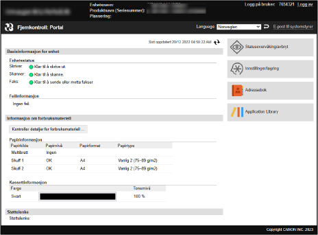 Når du logger inn på Fjernkontroll, vises portalsiden (fremsiden for Fjernkontroll). Herfra kan du sjekke brukstatus for maskinen, vise ulik informasjon og endre innstillingene ved bruk av knapper.