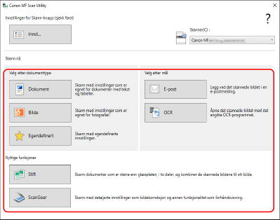 Velg skannerdriver (ScanGear MF eller WIA) for maskinen og konfigurer skanneinnstillingene.