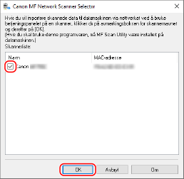 Maskinen som ble lagt til vises i [Product Name:] i hoveddialogboksen [Canon MF Scan Utility].