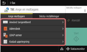 Ange mottagareAnvänd [Adressbok] eller [Kodad uppringning] när du vill skicka kopior till andra mottagare eller hemliga mottagare.
