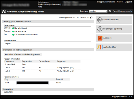 När du loggar in på fjärranvändargränssnittet visas portalsidan (startsidan i fjärranvändargränssnittet). Härifrån kan du kontrollera enhetens åtgärdsstatus, se olika typer av information och ändra inställningar för knappfunktionerna.
