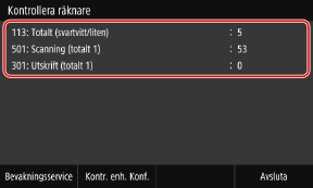 Funktioner som finns tillgängliga på skärmen med kontrollräknareInformationen som visas på skärmen varierar mellan olika länder och regioner. Tryck på [Bevakningsservice] när du vill kontrollera anslutningen till övervakningsservern. Utför den här funktionen för att regelbundet skicka information från enheten till övervakningsservern. Tryck på [Kontr. enh. Konf.] när du vill kontrollera vilka inställningar som har valts för enheten.