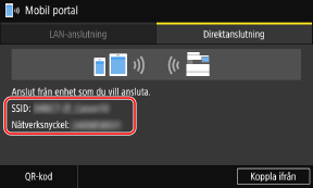När [Maximalt antal trådlösa enheter anslutna med Direktanslutning har nåtts.] visas kan du inte ansluta en ny mobil enhet innan en ansluten mobil enhet har kopplats bort. Tryck på [Koppla ifrån]  [Ja] när du vill koppla bort en ansluten mobil enhet.