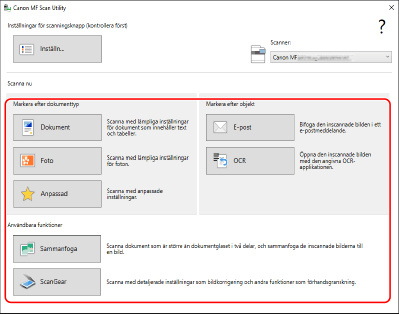 Välj skannerdrivrutinen (ScanGear MF eller WIA) för enheten och ange skanningsinställningar.