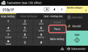 När du skickar fax till mottagare i utlandet anger du prefixet för utlandssamtal, landsnumret och faxnumret i nämnd ordning. Tryck på [Pausa] mellan numren för att lägga till en paus.