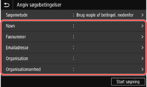 4 | Vælg [Søgemetode], og vælg søgebetingelserne. For at søge efter brugere, som imødekommer alle elementer angivet i trin 3, skal du vælge [Brug alle betingelser nedenfor]. For at søge efter brugere, som imødekommer nogen af elementerne angivet i trin 3, skal du vælge [Brug nogle af betingel. nedenfor]. |
