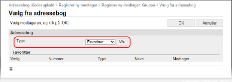 I [Type] skal du vælge [Favoritter] eller [Kodet opkald] og klikke på [Vis] for at ændre visningen af adressekartoteket.