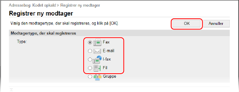 Redigering eller sletning af registrerede destinationerDu kan redigere de registrerede oplysninger ved at klikke på den destination, du vil redigere på skærmen i trin 4. I trin 4 skal du klikke på [Slet] til højre for den destination, du ønsker at slette, og destinationen vil blive slettet. Hvis destinationen i adressekartoteket er angivet med "Favoritindstillinger," anvendes redigerings- eller sletningshandlingen også i "Favoritindstillinger." Registrering og hentning af favoritindstillinger |