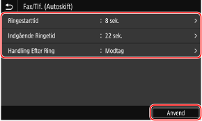 Indstil ringetiden og handlingen ved modtagelse af en fax, og tryk på [Anvend].
