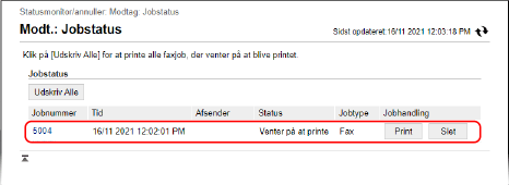 Når du klikker på jobnummeret, vises skærmen [Jobdetaljer]. Du kan få vist modtagelsestiden og antallet af sider, og se eksempelvisning af fax.