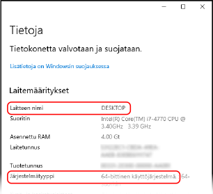 Jos tietokoneessa on 64-bittinen käyttöjärjestelmä, näytetään "64-bittinen käyttöjärjestelmä".