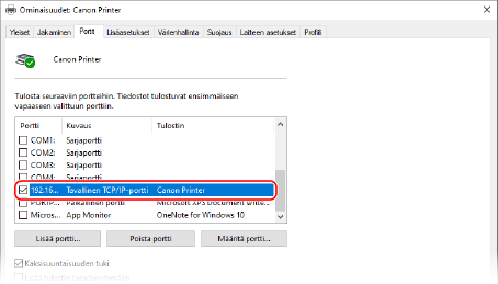 Jos laitteen IP-osoite muuttuuTarvittava toimenpide vaihtelee käytettävän portin mukaan. Jos [Canon MFNP Port] näytetään kohdassa [Kuvaus], yhteyttä pidetään yllä niin kauan kuin laite ja tietokone kuuluvat samaan aliverkkoon, joten tietokoneessa ei tarvita mitään toimenpiteitä. Jos [Standard TCP/IP Port] näytetään kohdassa [Kuvaus], sinun täytyy lisätä uusi portti. Portin lisääminen |