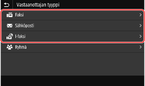 Kohteiden voidaan rekisteröidä osoitekirjaan ohjauspaneelia käyttämällä. Voit rekisteröidä sähköpostiosoitteita (sähköposti, I-faksi) ja faksinumeroita seuraavilla tavoilla: Rekisteröi kohteita syöttämällä niiden tiedot suoraan. Rekisteröi kohteita avaamalla lähetystyöloki. Rekisteröi kohteita hakemalla LDAP-palvelimella hallittuja käyttäjätietoja. |