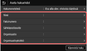 4 | Valitse [Hakumenetelmä] ja valitse hakuehdot. Jos haluat hakea käyttäjiä, jotka täyttävät kaikki vaiheessa 3 määritetyt ehdot, valitse [Kaikki alla olevat ehdot käytössä]. Jos haluat hakea käyttäjiä, jotka täyttävät jonkin vaiheessa 3 määritetyn ehdon, valitse [Osa alla olev. ehdoista käytössä]. |
