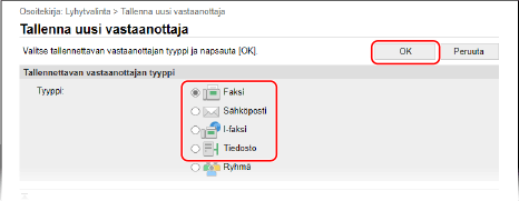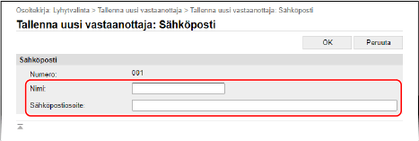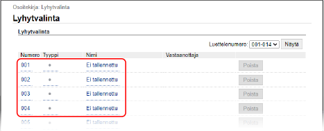 Rekisteröityjen kohteiden muokkaaminen tai poistaminenVoit muokata rekisteröityjä tietoja napsauttamalla muokattavaa kohdetta vaiheen 4 näytössä. Napsauta vaiheessa 4 [Poista] poistettavan kohteen oikealla puolella, niin kohde poistetaan. Jos osoitekirjassa oleva kohde on määritetty suosikkiasetuksilla, muokkaus- tai poistamistoimintoa käytetään myös suosikkiasetuksiin. Suosikkiasetusten rekisteröiminen ja kutsuminen |