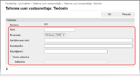 4 | Syötä kansion polku. Jaettu kansio Syötä jaetun kansion polku. Käytä merkkiä "\" erottimena. Syöttöesimerkki: kun jaetun kansion polku on C:\users\public\share users\public\share FTP-palvelin Syötä polki kansioon, johon tiedosto tallennetaan. Käytä merkkiä "/" erottimena. Merkin "/" käyttäminen alussa luo absoluuttisen polun, ja sen jättäminen pois luo suhteellisen polun FTP-palvelimelle kirjautuneen käyttäjän nykyisestä hakemistosta. Jos syötetyssä polussa ei ole kansiota, kansio, jolla on syötetty nimi, luodaan, kun tiedosto tallennetaan ensimmäisen kerran. * Jos pääkansiota ei ole tai sinulla ei ole pääkansion kirjoitusoikeutta, tapahtuu lähetysvirhe eikä kansiota luoda. |