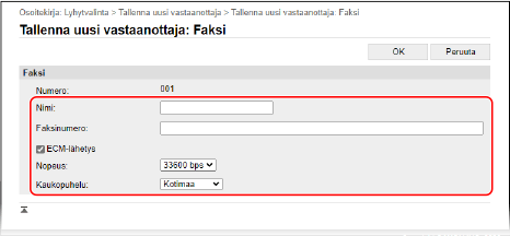 2 | Aseta faksin lähetystiedot tarvittaessa. Jos tapahtuu lähetysvirhe tai faksin lähettäminen rekisteröityyn numeroon kestää pitkään, aseta faksin lähetystiedot. [ECM-lähetys]*1 Jos tämä on valittu ja lähetettävässä kuvassa tapahtuu virhe, laite korjaa kuvan eikä lähetä vääristynyttä kuvaa. [Nopeus]*1 Jos faksin lähetyksen alkaminen kestää kauan, esimerkiksi kun puhelinlinjan yhteys on heikko, laite laskee tiedonsiirron aloitusnopeutta. [Kaukopuhelu] Jos tapahtuu tietoliikennevirhe lähetettäessä faksia ulkomaiseen kohteeseen, valitse [Ulkomaa (1)]. Jos virhe ei poistu, valitse [Ulkomaa (2)] ja [Ulkomaa (3)] tässä järjestyksessä. *1 Jos tätä ei aseteta tässä, käytetään asetusta kohdasta [Asetukset/Tallennus] [Lähetysasetukset] [Faksin lähetysasetukset]. [ECM-lähetys] [Lähetyksen aloitusnopeus] |