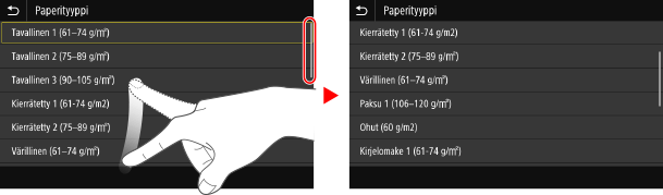 Jos näytössä näkyy vierityspalkki, se tarkoittaa, että kaikkia kohteita tai tietoja ei voida näyttää kokonaan näytössä. Vieritä näyttöä pyyhkäisemällä tai vetämällä haluamaasi suuntaan.