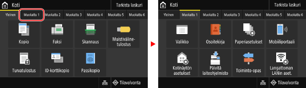 Kosketa näyttöä ja pyyhkäise sormenpäällä. Näyttö liikkuu pyyhkäisemääsi suuntaan. Esimerkiksi [Koti]-näyttö siirtyy pyyhkäisysuunnassa olevaan välilehteen.