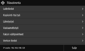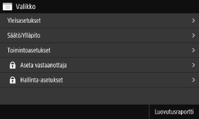 Näytön muuttaminenVoit muuttaa ohjauspaneelin näyttöä esimerkiksi vaihtamalla näytön kielen ja yksiköt ja näyttämällä tai piilottamalla viestejä. [Näyttöasetukset] Voit kääntää näytön värit vastakkaisiksi ja säätää kirkkautta näytön katselemisen helpottamiseksi. [Käytettävyys] Asetusten tyhjentäminen automaattisestiOletusarvoisesti, jos mitään toimintoja ei suoriteta tietyn ajan kuluessa, näytössä määritettävät asetukset tyhjennetään ja [Koti]-näyttö tulee esiin. Voit muuttaa aikaa ennen asetusten tyhjentämistä ja sen jälkeen esiin tulevaa näyttöä. [Automaattinen nollausaika] [Toiminta aut. noll. jälkeen] |