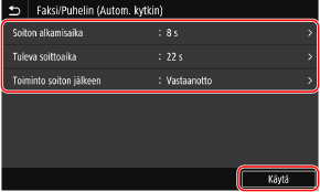 Jos [Faksi/Puhelin (Autom. kytkin)] on käytössä sen määrittämiseksi, onko saapuva puhelu faksi, voit määrittää myös asetukset, kuten soittoajan.