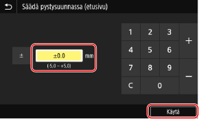Määritä säätöleveys valitsemalla positiivinen arvo oikealle siirtämiseksi paperilla tai negatiivinen arvo vasemmalle siirtämiseksi paperilla.