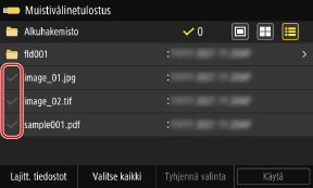 * Et voi valita samaan aikaan sekä PDF-tiedostoja että kuvatiedostoja (JPEG tai TIFF).