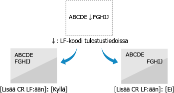 Valitse, lisätäänkö rivinvaihto (CR), kun laite vastaanottaa rivinvaihtokoodin (LF). Jos valitaan [Kyllä], tulostuskohta siirtyy seuraavan rivin alkuun, kun laite vastaanottaa LF-koodin. Jos valitaan [Ei], tulostuskohta siirtyy seuraavalle riville heti vastaanotetun LF-koodin alapuolelle. |