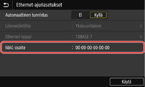 Voit näyttää laitteeseen asetetun MAC-osoitteen, kun laite on yhdistetty langalliseen lähiverkkoon.