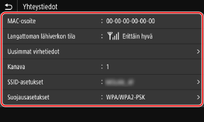 Langattoman lähiverkon MAC-osoitteen ja yhteystietojen lisäksi voit näyttää myös suojausasetukset, kun laite on yhdistetty langattomaan lähiverkkoon.