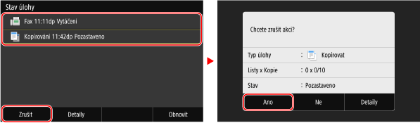 Pokud se zobrazí obrazovka se seznamem úloh, vyberte úlohu, kterou chcete zrušit, a stiskněte tlačítko [Zrušit]