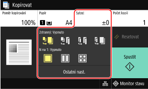 Kromě základních nastavení kopírování má zařízení také nastavení pro oboustranné kopírování, nastavení jakosti obrazu a další nastavení podle originálu a účelu. K nakonfigurování těchto nastavení použijte obrazovku kopírování.